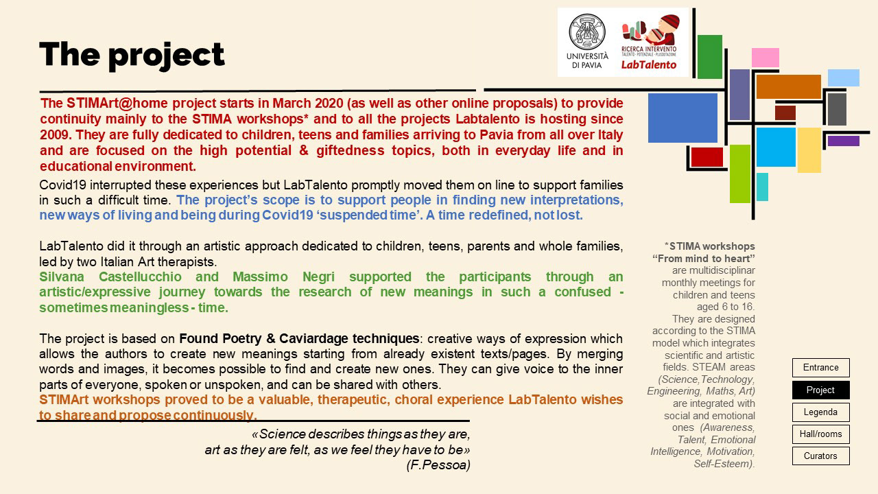 Here is a virtual exhibition born in Italy during the first Covid-19 lockdown (March - April, 2020). Families, children & teenages tried to find the meaning of the suddenly changed world through art.